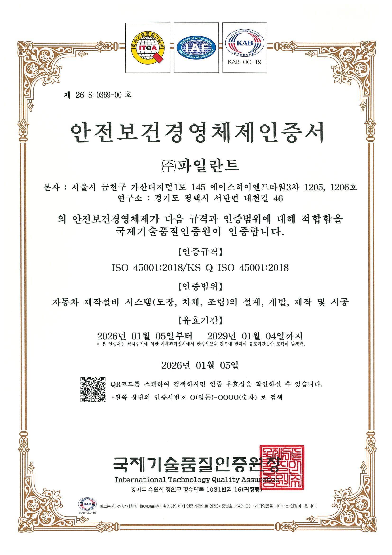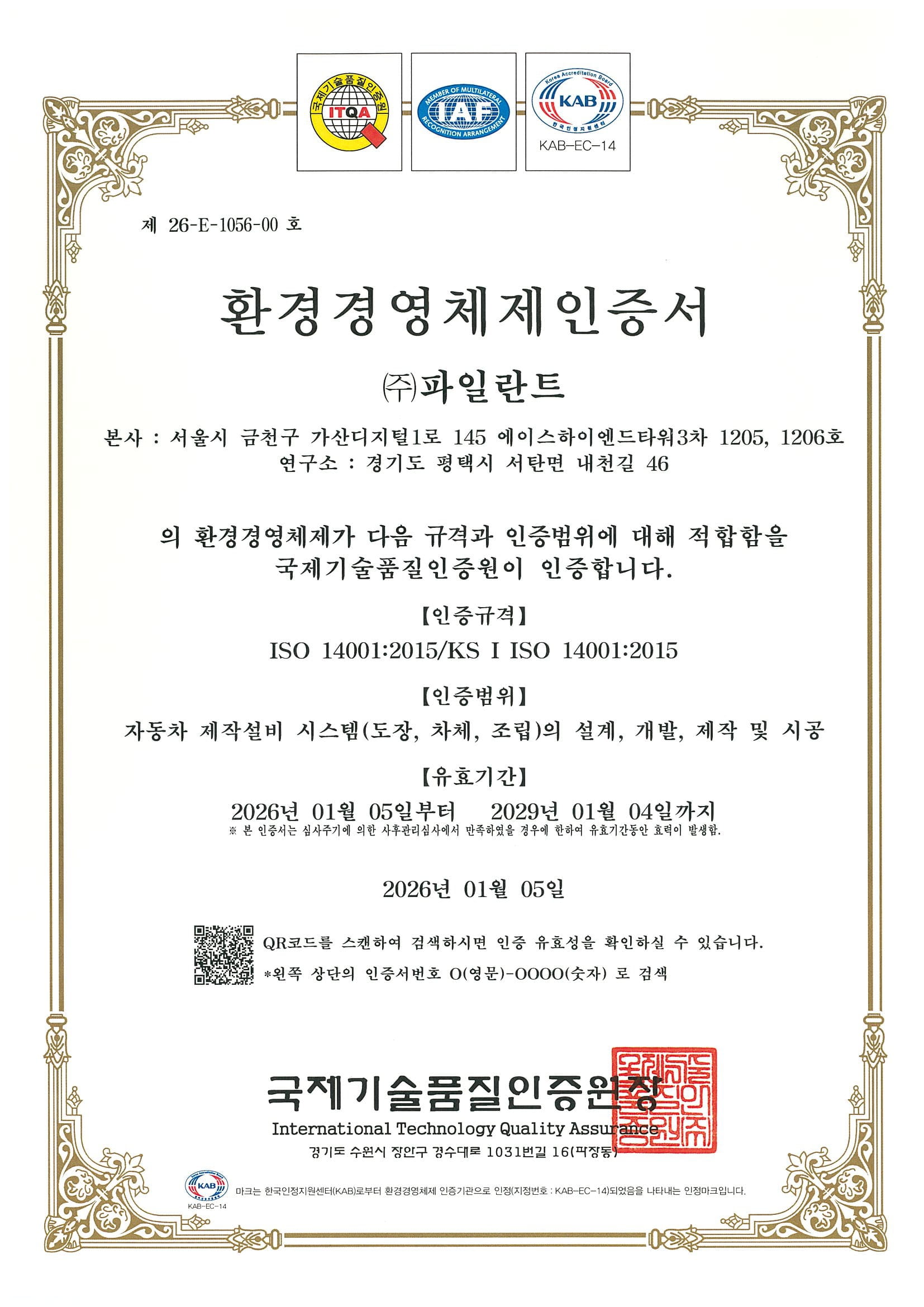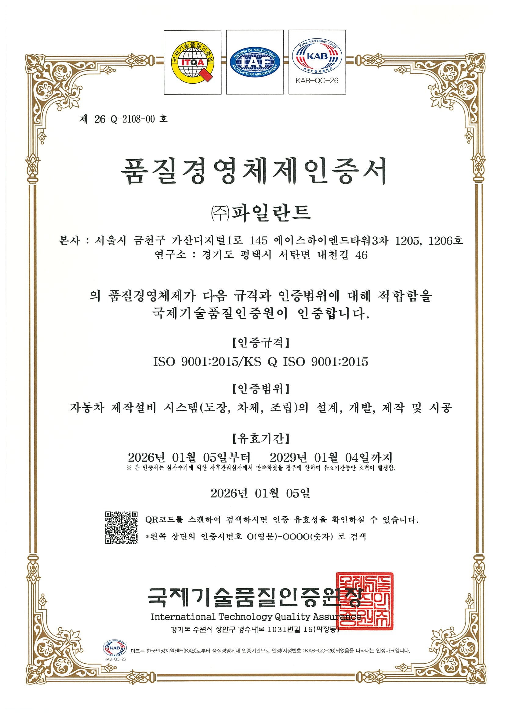 (주)파일란트가 보유한 국내외 주요 인증은 최고의 품질과 가치를 전달하겠다는 고객 여러분과의 약속이자 증거입니다.